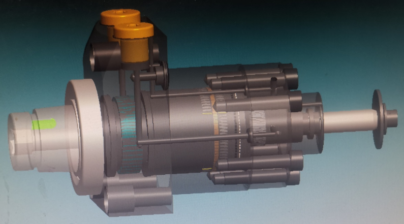 Pistonstangens overflade er bearbejdet med spiralskår med en bestemt stigning, og en fast føringstift er monteret på endeskålen. Når trykolie driver pistonstangen aksialt, får vekselvirkningen mellem føringstiften og spiralskåret aksialforskydningen af pistonstangen til at omdannes til en roterende bevægelse omkring sin akse, hvilket muliggør kontrolleret spiralformet ud- og indtrækning.